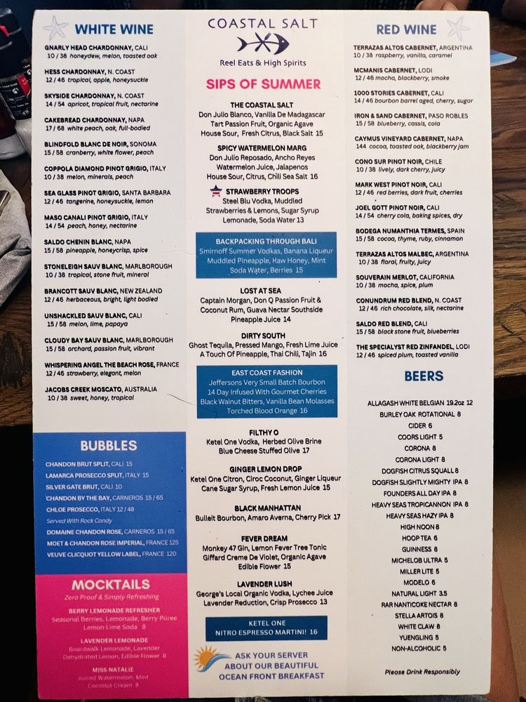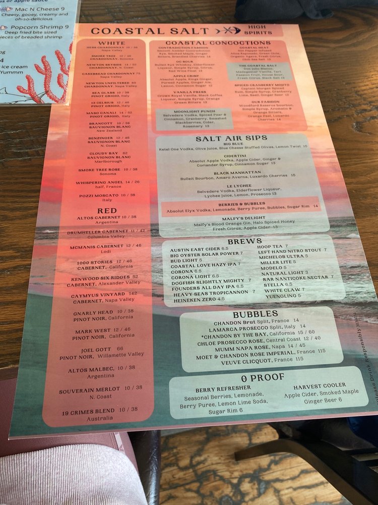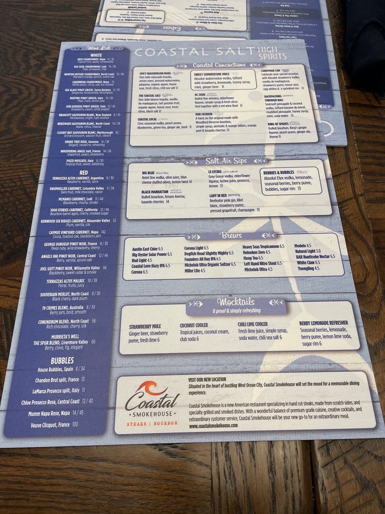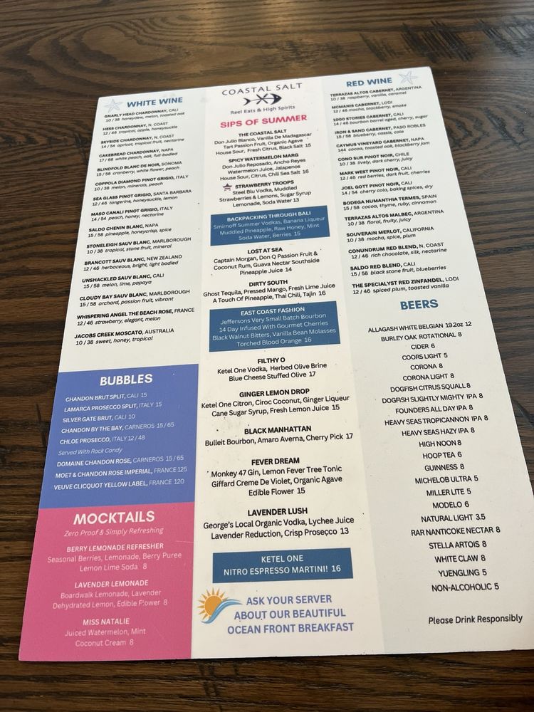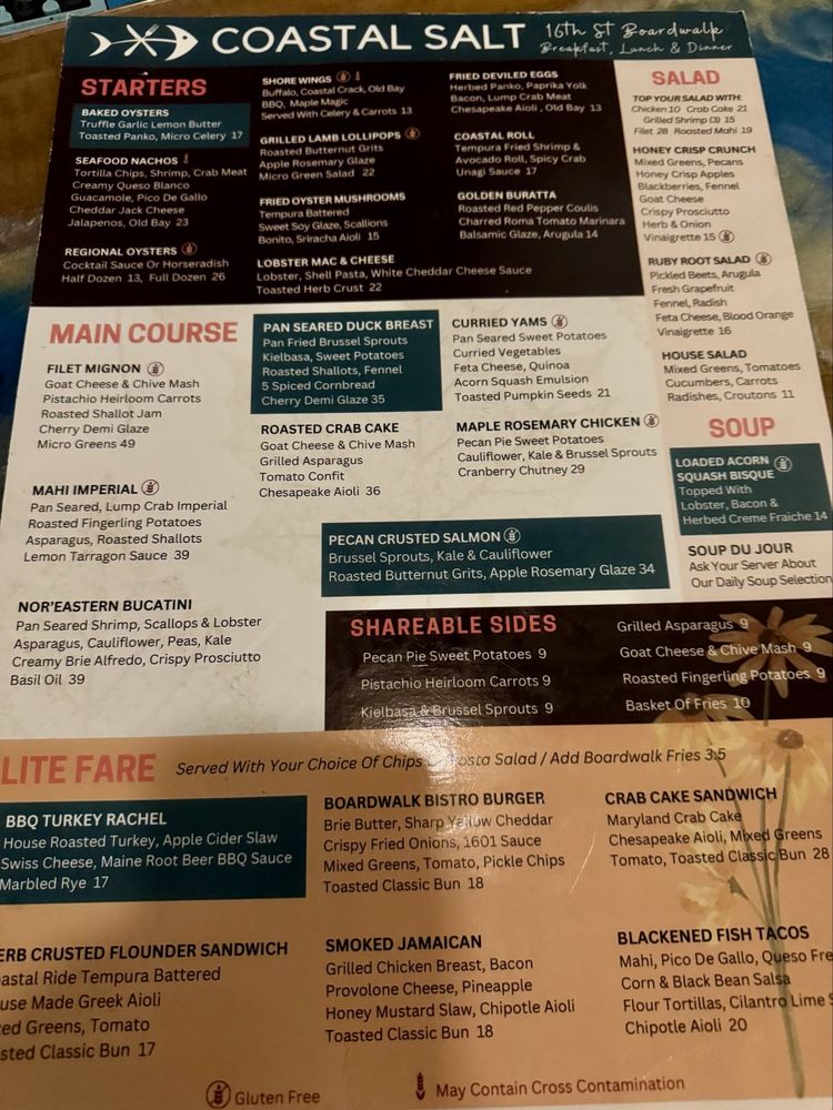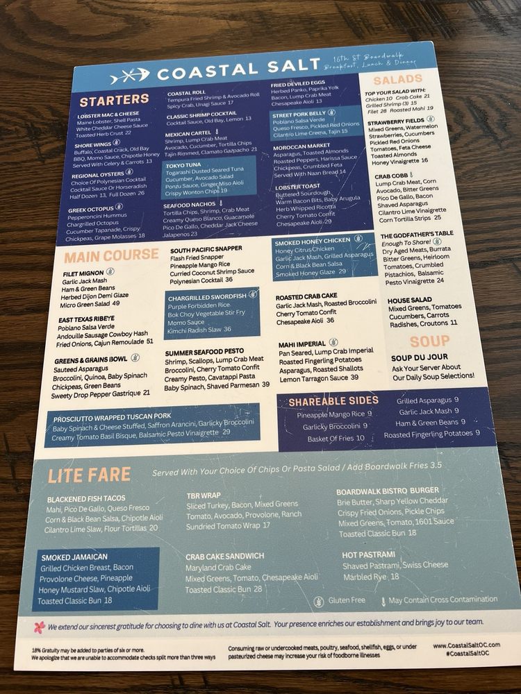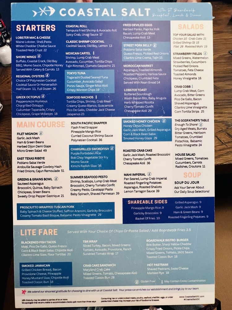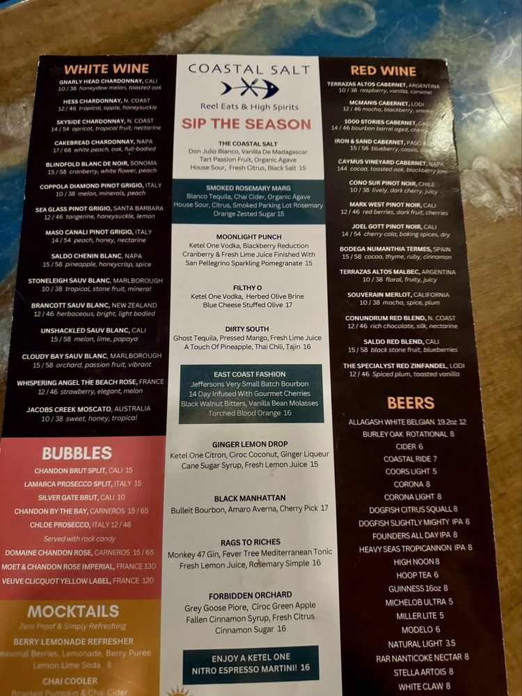 Coastal Salt, located in Ocean City, MD, offers a diverse menu of seafood dishes, sandwiches, and cocktails. The restaurant provides a casual and tourist-friendly atmosphere with options for takeout, delivery, and reservations. With a focus on fresh seafood, customers have raved about the Lobster Mac & Cheese, Summer Seafood Pesto, and Filet Mignon. The menu also includes unique items like Fried Deviled Eggs and Seafood Nachos. Despite some mixed reviews on food quality, the exceptional customer service and pleasant atmosphere have left a lasting impression. The Swordfish paired with sautéed vegetables and Lobster Mac & Cheese have been standout choices for many patrons. Overall, Coastal Salt offers a range of dining options for seafood lovers and those looking for a memorable oceanfront experience.
